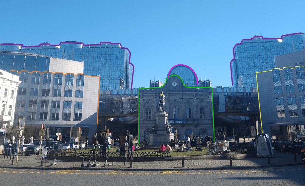 La primera linea esta compuesta por el centro de acogida de visitantes; conocido con el nombre de estación Europa y resaltado en la imagen por el contorno verde, allí se compila la información del complejo y se guía a los visitantes para mejorar la experiencia, al al lado izquierdo de contorno Naranja se encuentra el edificio Willy Brandt; cuarto canciller de Alemania y diputado de parlamento de 1979 a 1982, quien recibió el premio Nobel de la paz por mejorar las relaciones entre Alemania del Este, Polonia y la Unión Soviética. A la derecha de la Estación Europa y resaltado en Amarillo en la imagen se encuentra el edificio József Antall, Primer ministro de Hungría elegido democráticamente tras la caída del comunismo.